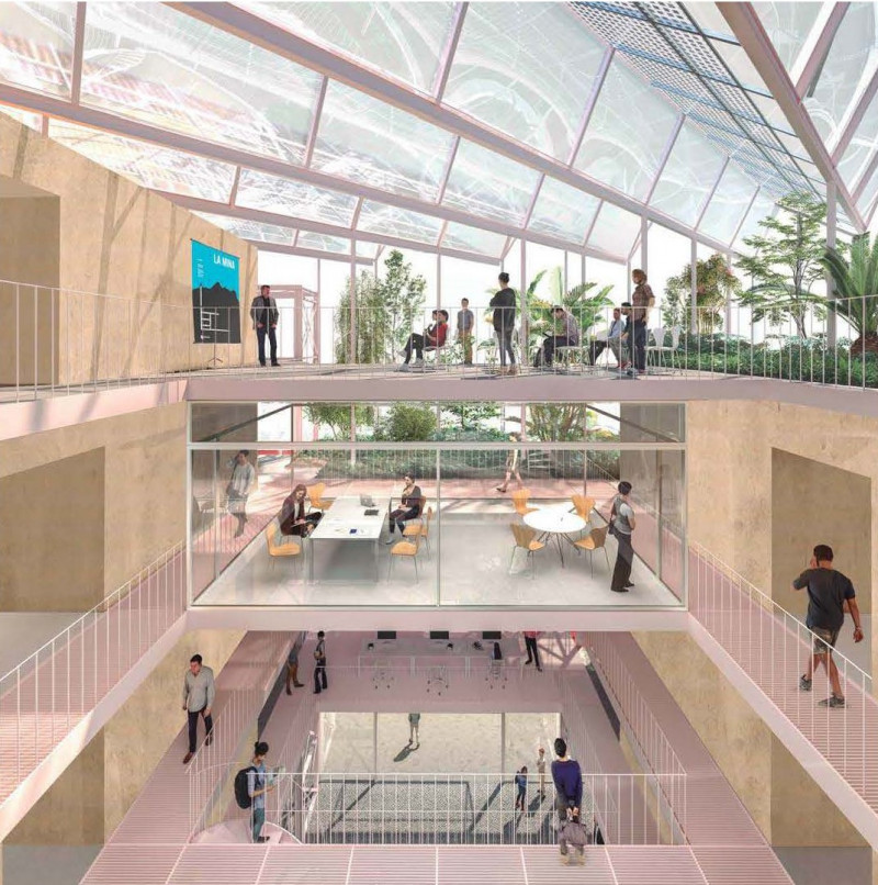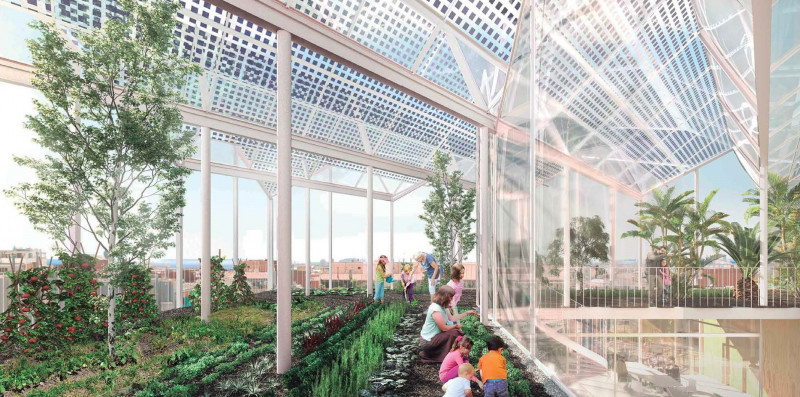 La cubierta se convierte en un espacio cívico con jardines, huertos y sistemas de energía renovable, combinando sostenibilidad y uso ciudadano.