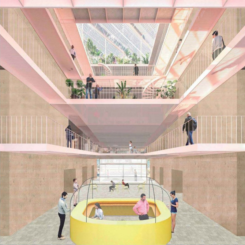 Un gran espacio central articula las salas y favorece la relación visual entre plantas, mientras que la estructura modular permite una gran flexibilidad de distribución.